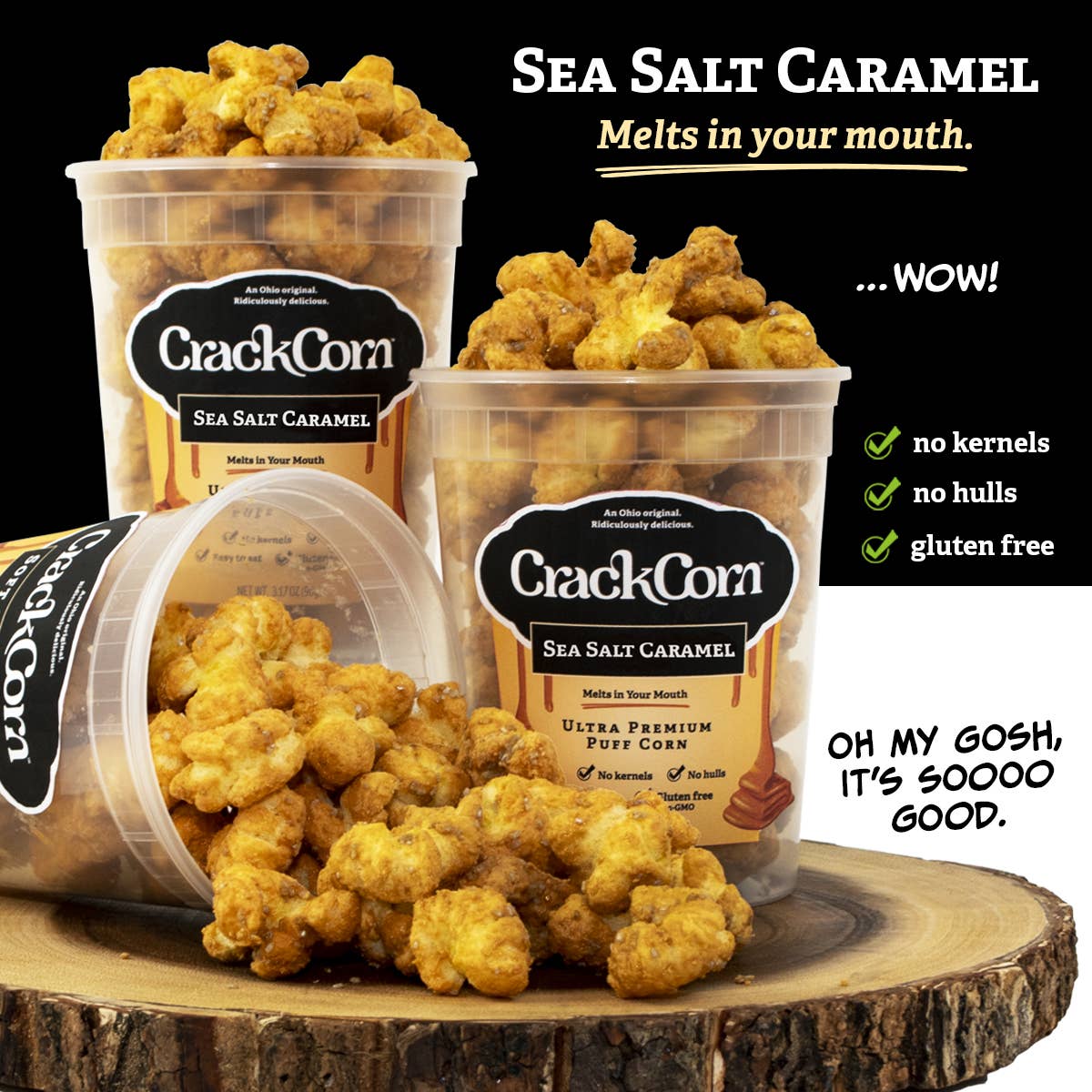 Crack Corn is like popcorn, but there are No Kernels and No Hulls. That means nothing gets stuck in your teeth. And they taste amazing! Available in 10 incredible flavors. SEA SALT CARAMEL is so soft it melts in your mouth. Buttery, salty, and sweet. And of course nothing gets stuck in your teeth.
