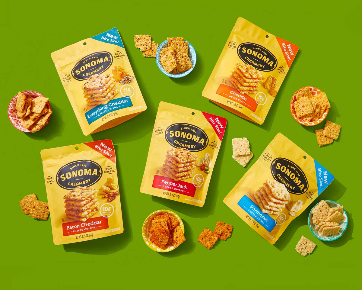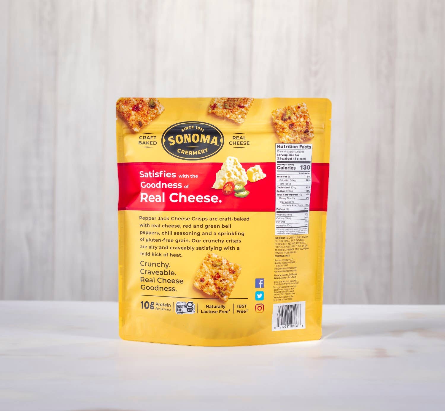 Sonoma Creamery Pepper Jack Cheese Crisps are lightly baked Crunchy Real Cheese™ Snacks. Based on our famous Sonoma Hot Pepper Jack recipe, we bake in 10-month Aged Parmesan and a sprinkling of certified Gluten-Free organic ancient grains for a crunchy, craveable bite. Each bite delivers a delightful crunch with a mild kick of heat.