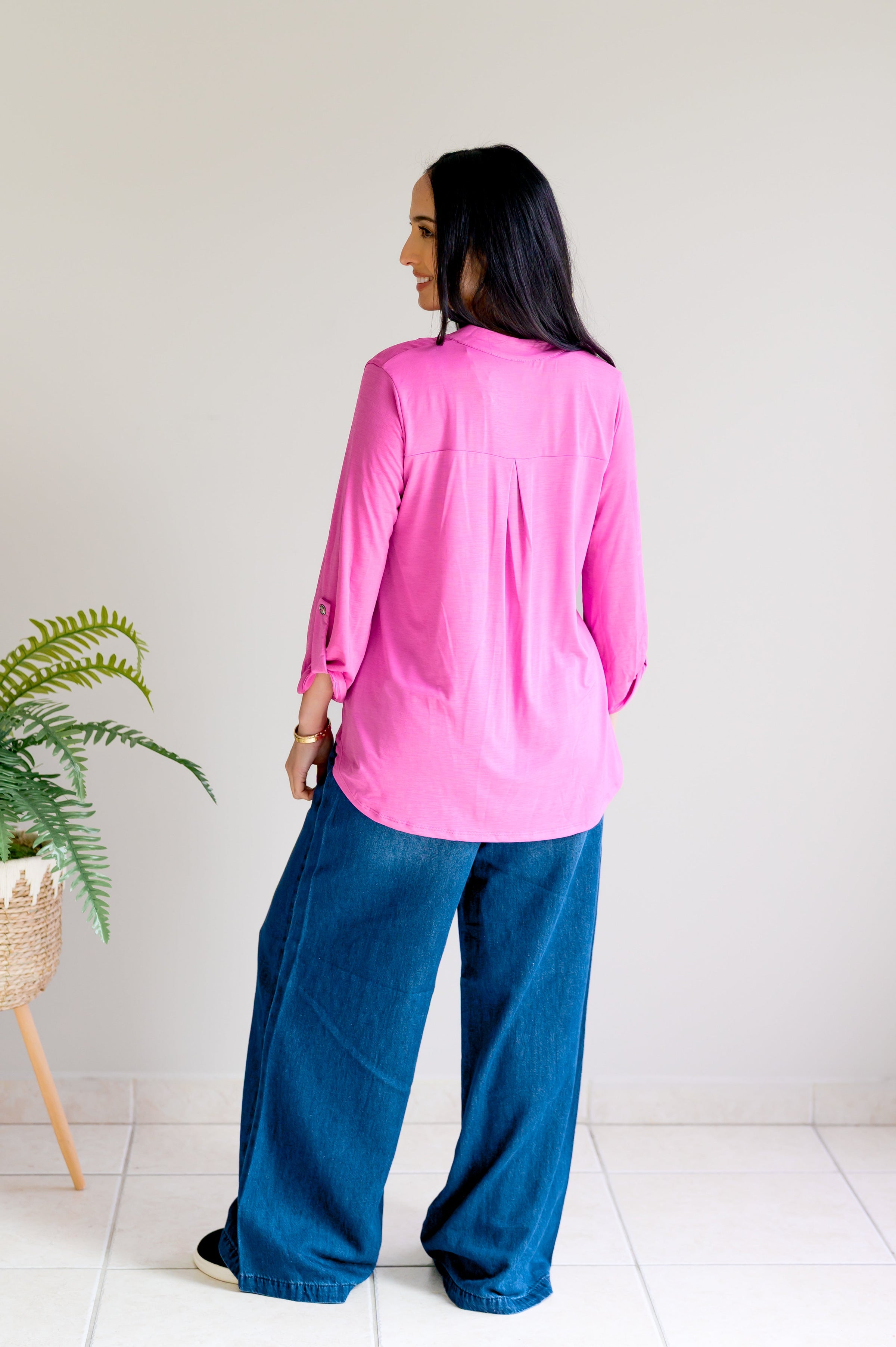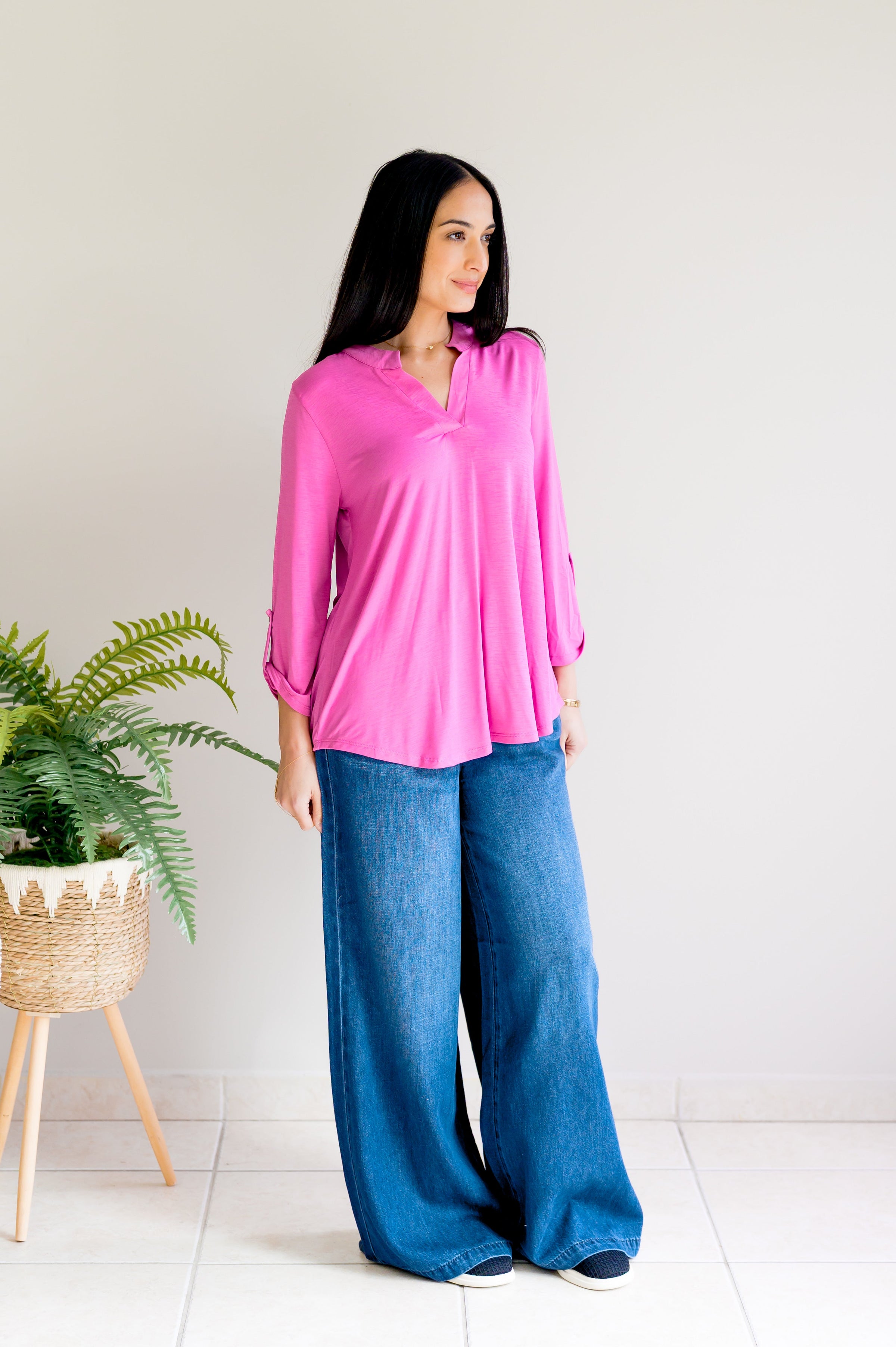Wrinkle-free and ready to go—the Lucy in the Sky Top in Magenta does the heavy lifting so you don't have to. Three-quarter sleeves with tab details, a mandarin collar, and notched neckline bring the style, while the relaxed fit and high-low hem keep things effortlessly trendy. No ironing, no stress, just pure fashion fun.